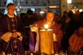 OSIJEK (TU) – U osječkoj konkatedrali sv. Petra i Pavla na Prvu nedjelju došašća, 30. studenoga 2025., đakovačko-osječki nadbiskup metropolit Đuro Hranić predvodio je svečano misno slavlje uoči proslave Dana grada Osijeka te je upalio prvu svijeću na adventskom vijencu ispred konkatedrale.