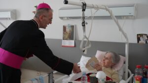 ĐAKOVO (TU) – Mons. Ivan Ćurić, đakovačko-osječki pomoćni biskup u pratnji zajednice Bogoslovnog sjemeništa u Đakovu s odgojiteljima, na čelu s preč. dr. sc. Stjepanom Radićem, rektorom u ponedjeljak, 30. ožujka 2026., u popodnevnim satima pohodili su Dom za starije i nemoćne osobe Đakovo o prigodi proslave predstojeće svetkovine Uskrsa. U pratnji biskupa Ivana bio je i preč. dr. sc. Zdenko Ilić, sudski vikar nadbiskupije