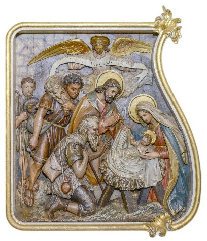 Božićna čestitka i pastirska poruka nadbiskupa Hranića grafički je opremljena slikom polikromiranog reljefa Kristova rođenja iz 1901. godine, koji se nalazi na bočnom oltaru u Župi Mučeništva sv. Ivana Krstitelja u Županji.