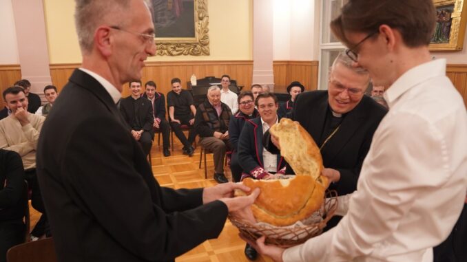 Radosno druženje nastavilo se nadbiskupovim lomljenjem kruha te zajedničkim domjenkom za bratskim stolom. Radosti druženja pridonio je i Bogoslovski tamburaški sastav, uz tradicionalne hrvatske božićne pjesme. Jakov Ujvari