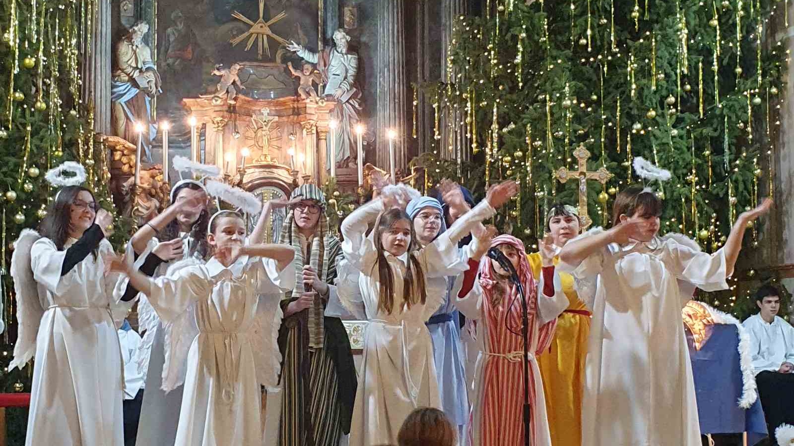 OSIJEK (TU) – Na dječjoj polnoćki, dramska skupina i dječji zbor osječke Župe Preslavnog Imena Marijina, u srijedu, 24. prosinca 2025. izveli su zajedno Božićni mjuzikl pod nazivom „Anđeoski live iz Betlehema“. Autorica teksta je Mirene Zake, koja je u mjuzikl uvrstila pjesme koje djeca rado pjevaju. Tema mjuzikla je bila kombinacija biblijskog života i života današnjice na moderan način.