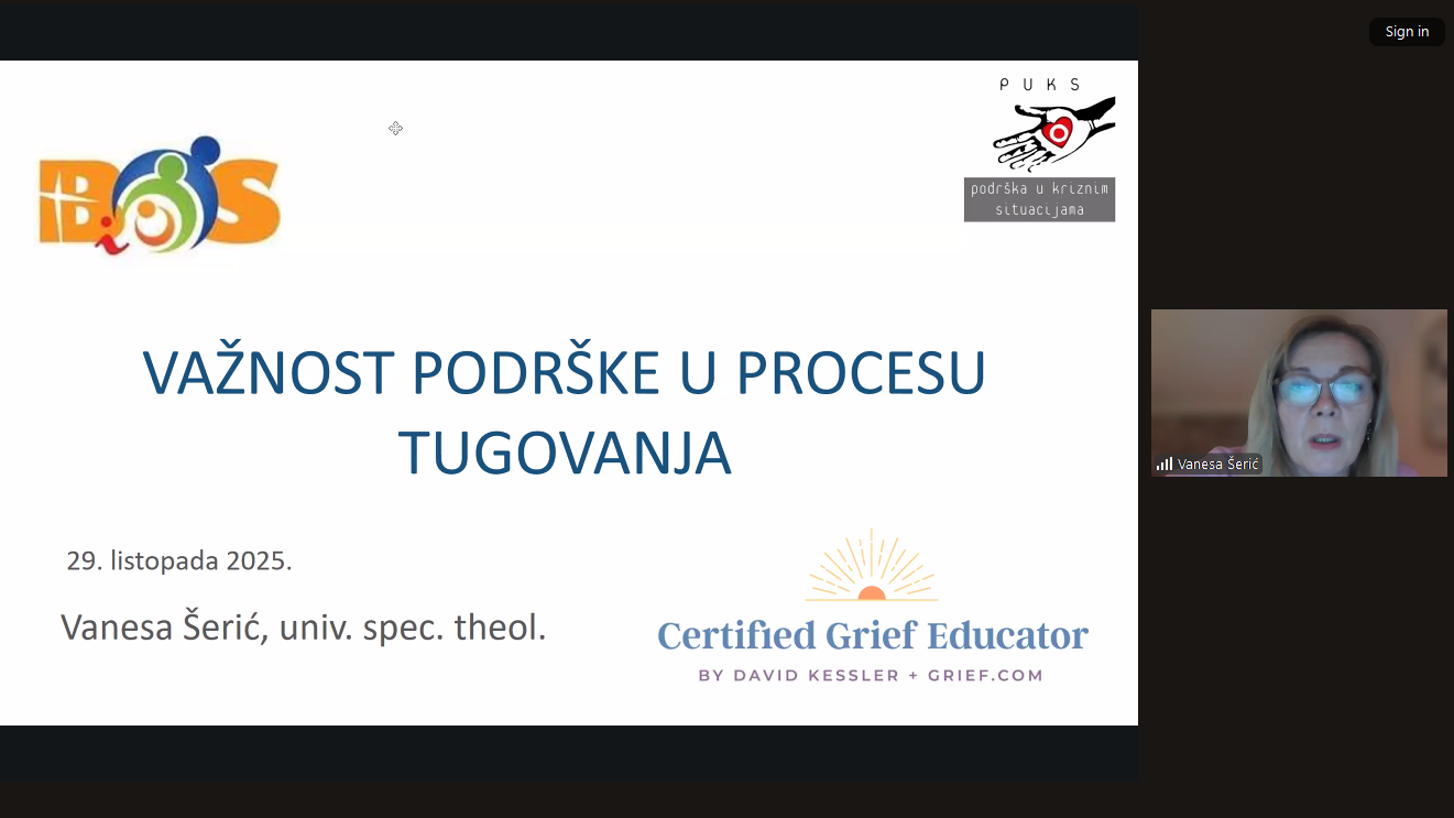 Predavanje pod naslovom „Važnost podrške u procesu tugovanja“ održala je Vanesa Šerić, univ. spec. theol., sveučilišni specijalist za pastoral kriznih situacija i certificirani edukator za podršku u tugovanju po metodi D. Kesslera. Webinar je putem Zoom platforme pratilo oko trideset sudionika.