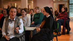 “Kakva je to ljubav?”, postavio je pitanje prof. Bošnjaković. „To je izabrana ljubav, uzljubio nas je Onaj koji nas je izabrao”, rekao je i pozivajući se na brojne autore, istaknuo kako su oči i uši vanjski organi srca. Slušanje je ljubav jer slušajući izlazim iz sebe i ono je radikalan odmak od sebe. Pitanjem, kojem djetetu prvome pristupiti, i odgovorom – onome koje je najpotrebnije – predavač je uputio slušatelje na prispodobu o milosrdnom Samarijancu i izložio 10 zapovjedi srca koje iz nje proizlaze. Vrativši se na encikliku Dilexit nos, prof. Bošnjaković je naglasio potrebu blagotvorne prisebnosti, uravnoteženosti, nježnosti, odgoja u prirodi, opasnosti narcisoidnosti koja sa sobom nosi nedostatak empatije, egocentričnost, preosjetljivost i obezvrijeđivanje drugih te važnosti pogleda kojega kateheta upućuje mladima. „Jedan Isusov pogled na carinika Mateja promijenio mu je život. To je bio najkraći poziv u Bibliji”, istaknuo je predavač. „Naši mladi žive u svijetu straha i zastrašivanja, a mi živimo u doba svadbe – Crkva je zaručnica Kristova”, naglasio je prof. Bošnjaković te podsjetio na retke iz 8. poglavlja Pjesme nad pjesmama, gdje mnoge vode ne mogu ugasiti ljubav, niti je rijeke potopiti. Svojom autorskom pjesmom Gospod je pjesmom stvorio svijet, prof. Bošnjaković je uz pratnju na gitari i uz podršku prisutnih, završio svoje poticajno predavanje.