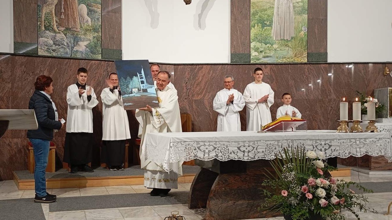 Fra Tomislav je nakon toga zahvalio najprije policijskoj klapi sv. Mihovila na dolasku, a onda i predslavitelju fra Ivanu te mu je na kraju darovao sliku s motivom crkve sv. Josipa Radnika u Belišću. Tekst i foto: Lucija Sipl