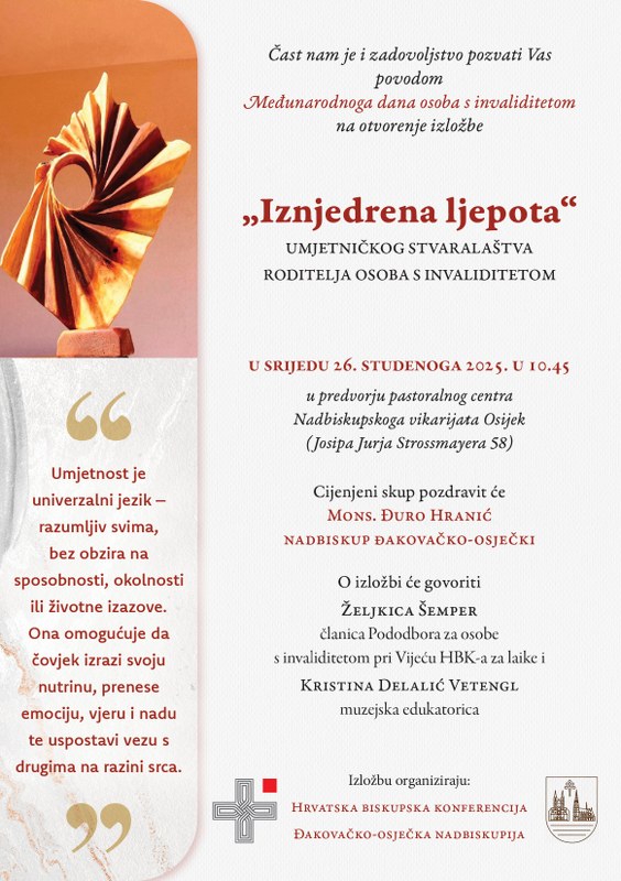 Povodom obilježavanja Međunarodnoga dana osoba s invaliditetom u staroj zgradi Nadbiskupskog vikarijata Osijek (Josipa Jurja Strossmayera 58) u srijedu 26. studenoga 2025. s početkom u 10 sati održat će se konferencija za novinare na kojoj će sudjelovati: đakovačko-osječki nadbiskup Đuro Hranić; gospićko-senjski biskup Marko Medo, predsjednik Vijeća HBK-a za laike i požeški biskup Ivo Martinović, predsjednik Vijeća HBK-a za život i obitelj.