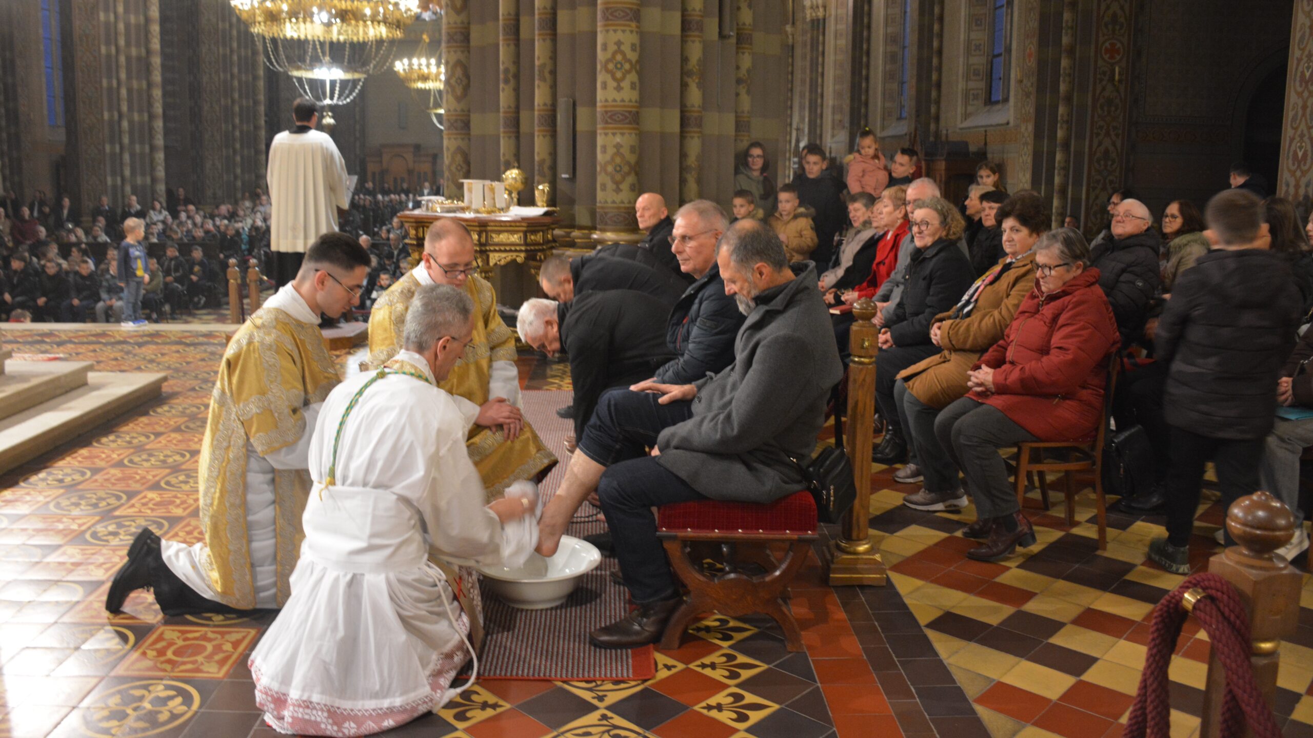 ĐAKOVO (TU) – Misu večere Gospodnje u đakovačkoja katedrali, u četvrtak, 2. travnja 2026. predvodio je đakovačko-osječki pomoćni biskup Ivan Ćurić u zajedništvu s nadbiskupom metropolitom Đurom Hranićem, katedralnim župnikom Alojzom Kovačekom i još osam drugih svećenika središnjih nadbiskupijskih ustanova. Posluživali su đakovački bogoslovi, a Mješoviti katedralni zbor je predvodio pjevanje.