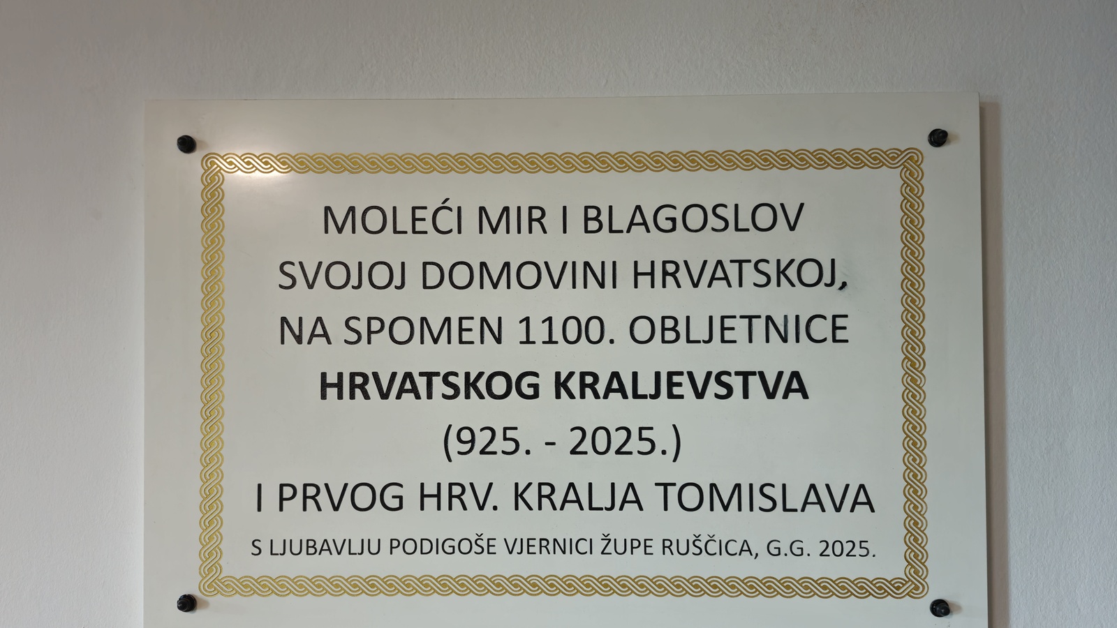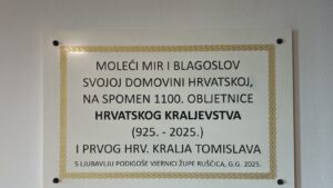 Tekst na spomen pločama glasi: Moleći za mir i blagoslov svojoj domovini Hrvatskoj, na spomen 1100. obljetnici Hrvatskog kraljevstva (925. – 2025.) i prvog hrvatskog kralja Tomislava s ljubavlju podigoše vjernici župe Klakar, g. g. 2025., a na drugoj ploči zadnja rečenica glasi …s ljubavlju podigoše vjernici župe Ruščica, g. g. 2025. Ivica Tušek/Foto: Franjo Gačić