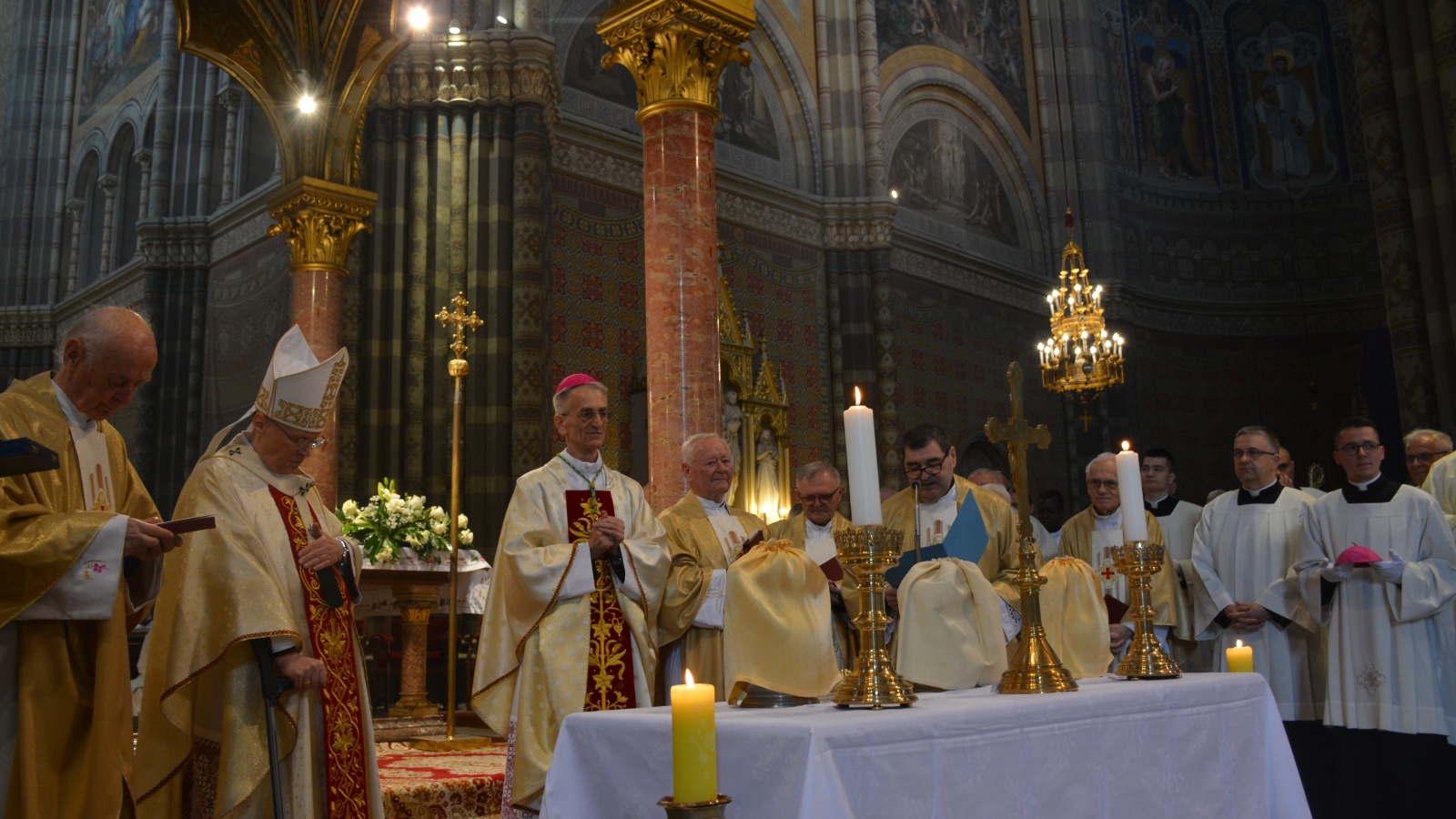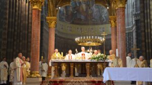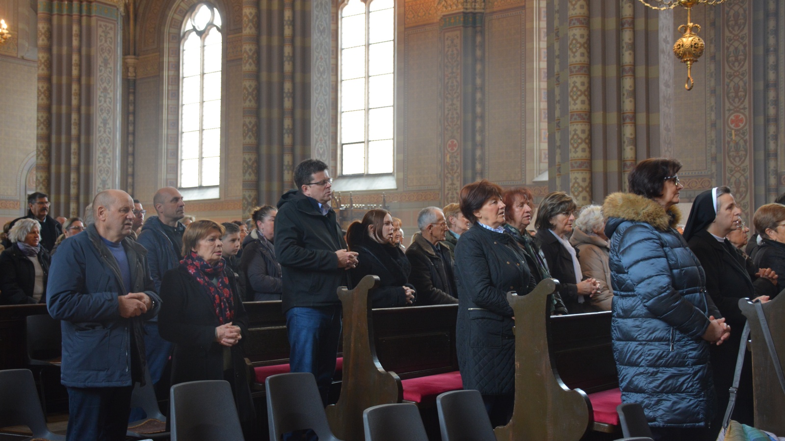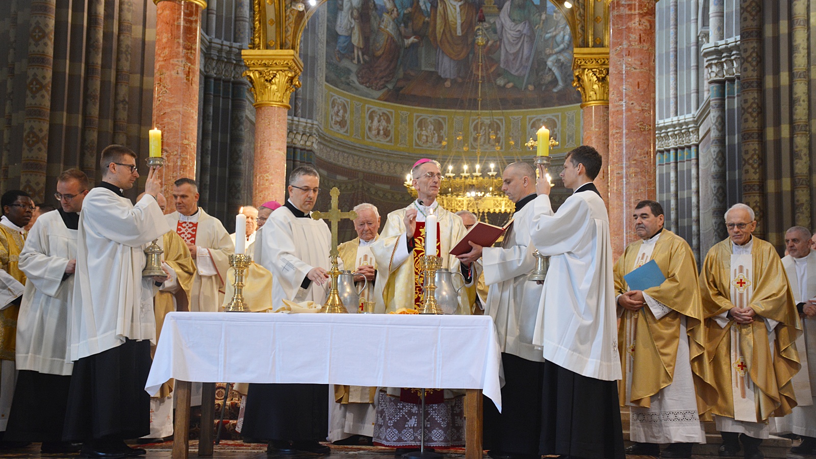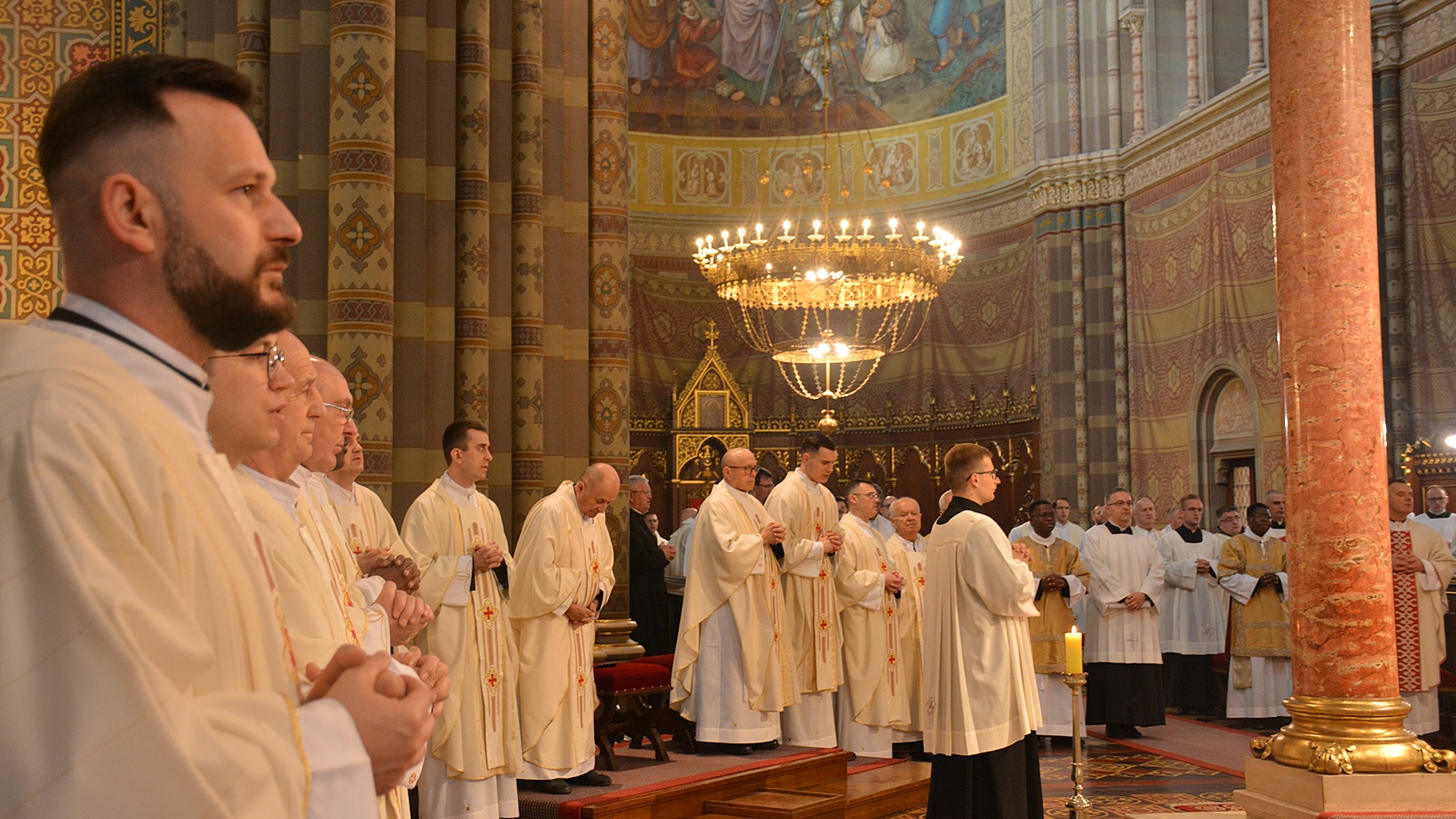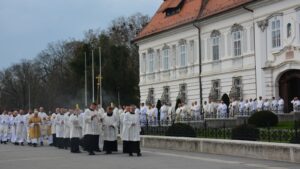Svečanu procesiju biskupa, svećenika, đakona i bogoslova s križem na čelu predvodio je katedralni ceremonijar vlč. mr. Dario Hrga, a kretala se od katedrale kroz dvorište Nadbiskupskog doma preko Trga J. J. Strossmayera da bi ušla u katedralu.