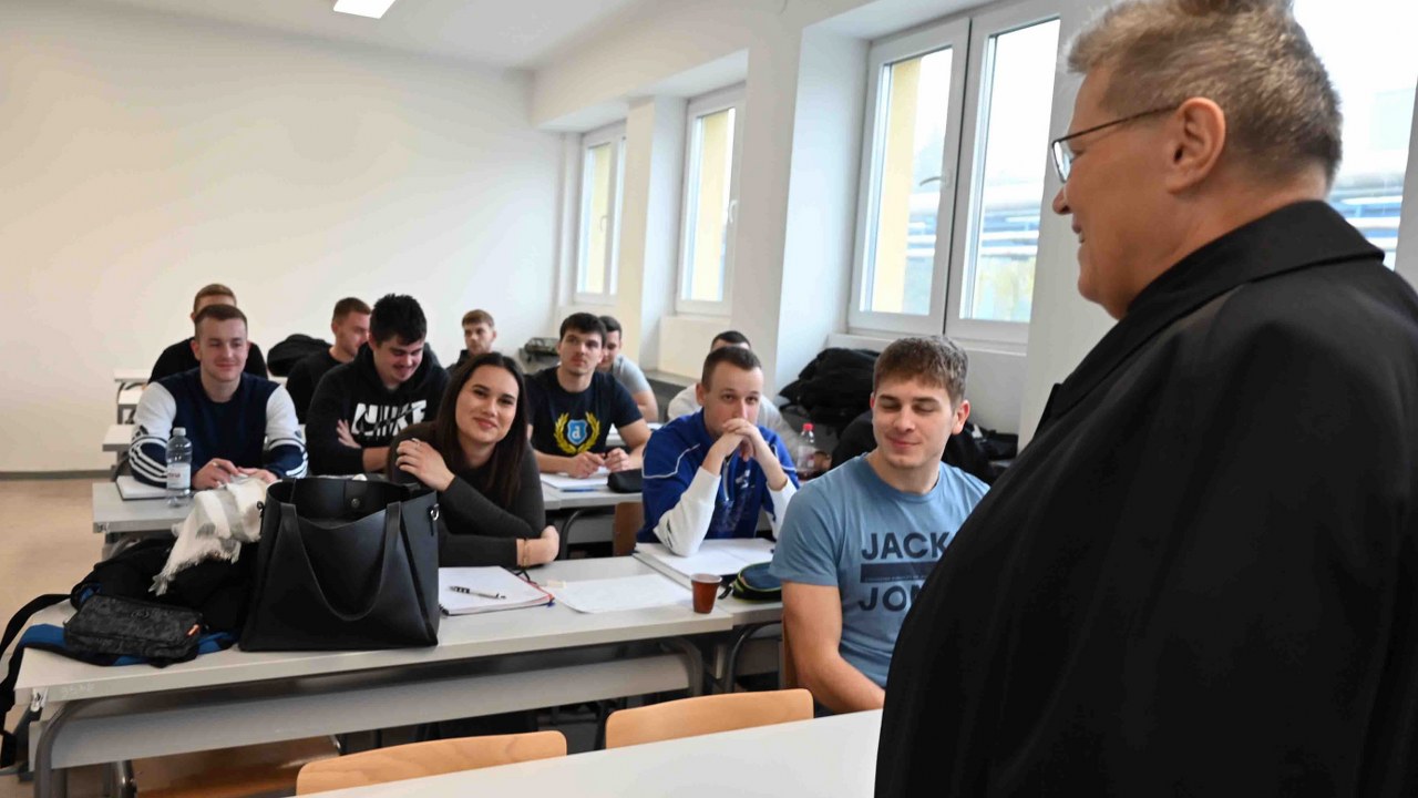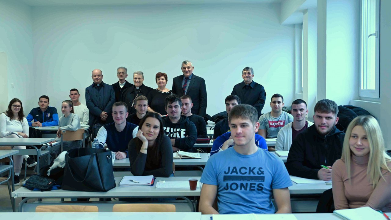 zgrada sveučilišta, koje je u rujnu ove godine blagoslovio biskup Ćurić, rektor prof. dr. sc. Ivan Samardžić kratko im je predstavio djelovanje sveučilišta od njegova osnivanja 2020. godine do danas. S ponosom je naglasio da je ove godine zaustavljen trend dosadašnjeg pada upisanih studenata, naglasivši kako je ove godine upisano 15 studenata više nego prošle godine te sada sveučilište broji 1.800 studenata među kojima su studenti iz raznih krajeva Hrvatske, ali i inozemstva. Iskazao je svoju radost da su, uz svu stručnost i odgovornost, među 140 profesora i djelatnika prepoznatljivi dobri međuljudski odnosi. Prezentirao je sve njihove dosadašnje projekte te humanitarne akcije koje provode tijekom cijele godine, a napose u vrijeme uskrsnih i božićnih blagdana kako bi pomogli potrebitima u svojoj sredini.