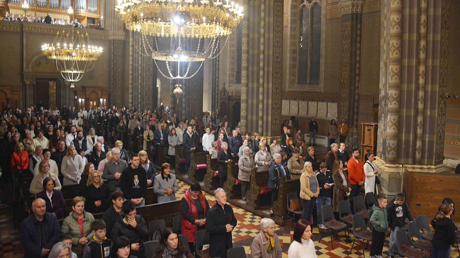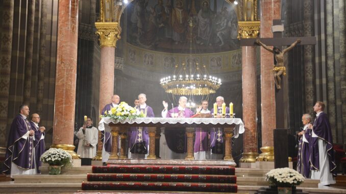 ĐAKOVO (TU) – Đakovačko-osječki nadbiskup metropolit Đuro Hranić u nedjelju, 2. studenoga 2025. predvodio je večernje misno slavlje Dušnoga dana ili Spomena svih vjernih mrtvih u đakovačkoj katedrali. U koncelebraciji su bili: mons. Ivan Ćurić, pomoćni biskup; vlč. Alojz Kovaček, katedralni župnik; preč. Mato Gašparović, ravnatelj UZUK-a; mons. Luka Marijanović, kanonik; vlč. mr. Dario Hrga, kancelar Nadbiskupskog ordinarijata; vlč. mr. Stjepan Matezović, duhovnik u Bogoslovnom sjemeništu i vlč. Stjepan Maroslavac, administrator Vjesnika. Posluživali su đakovački bogoslovi.