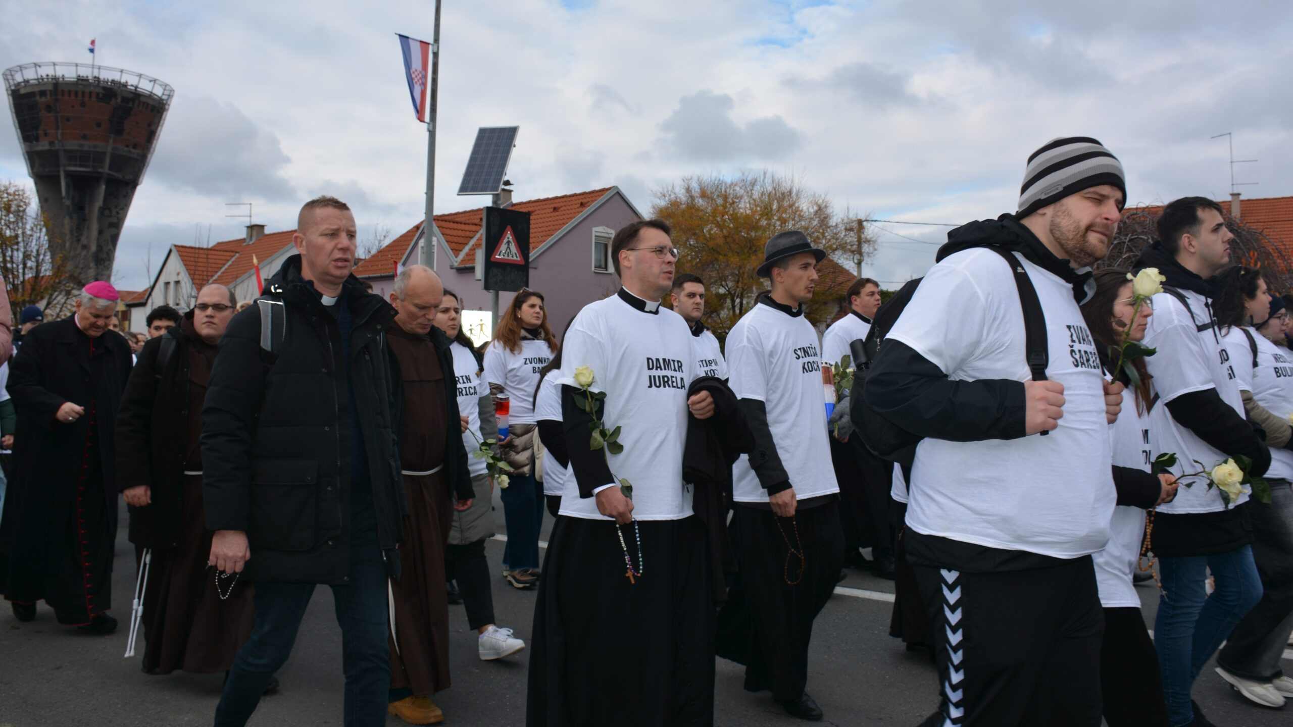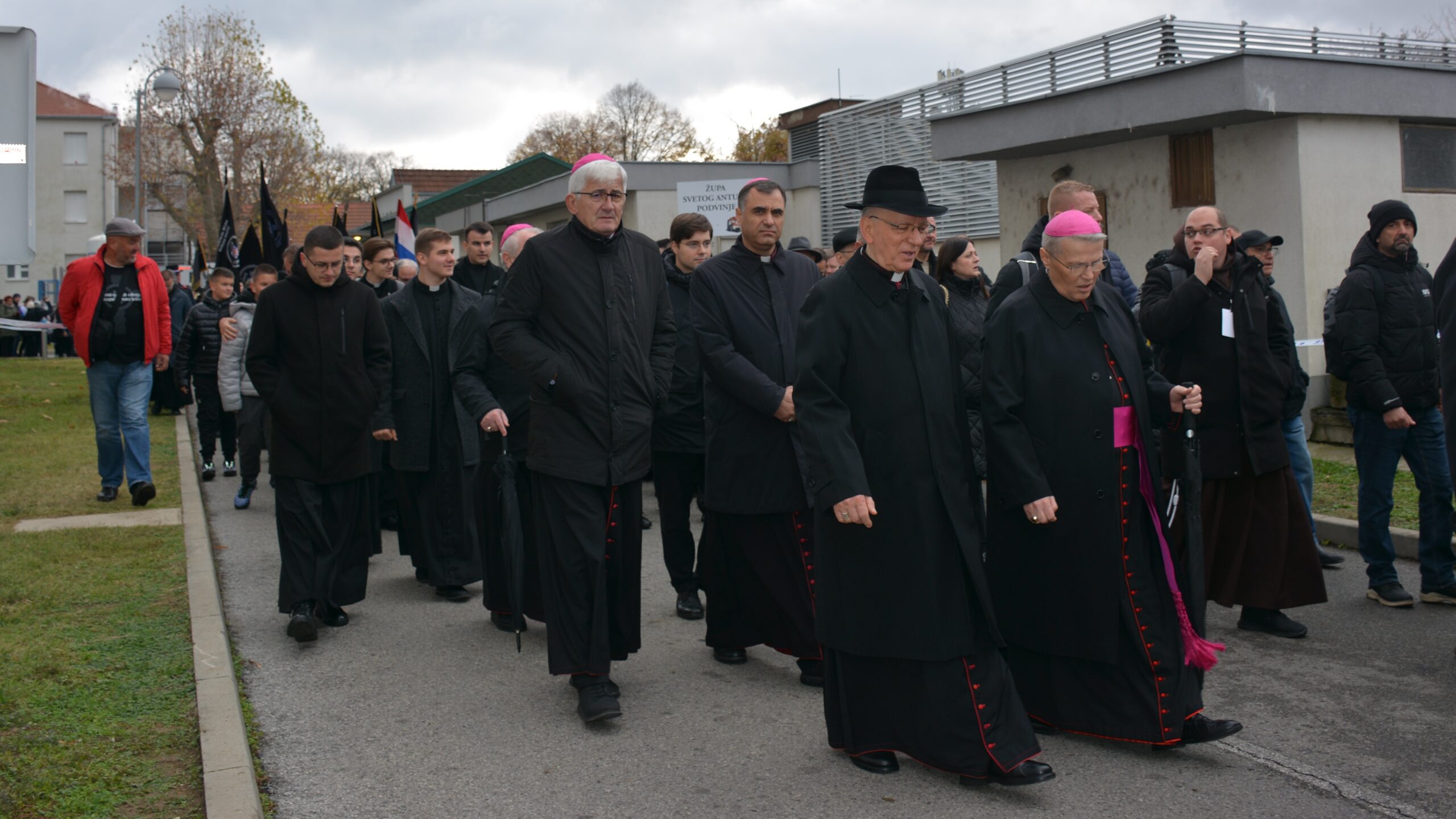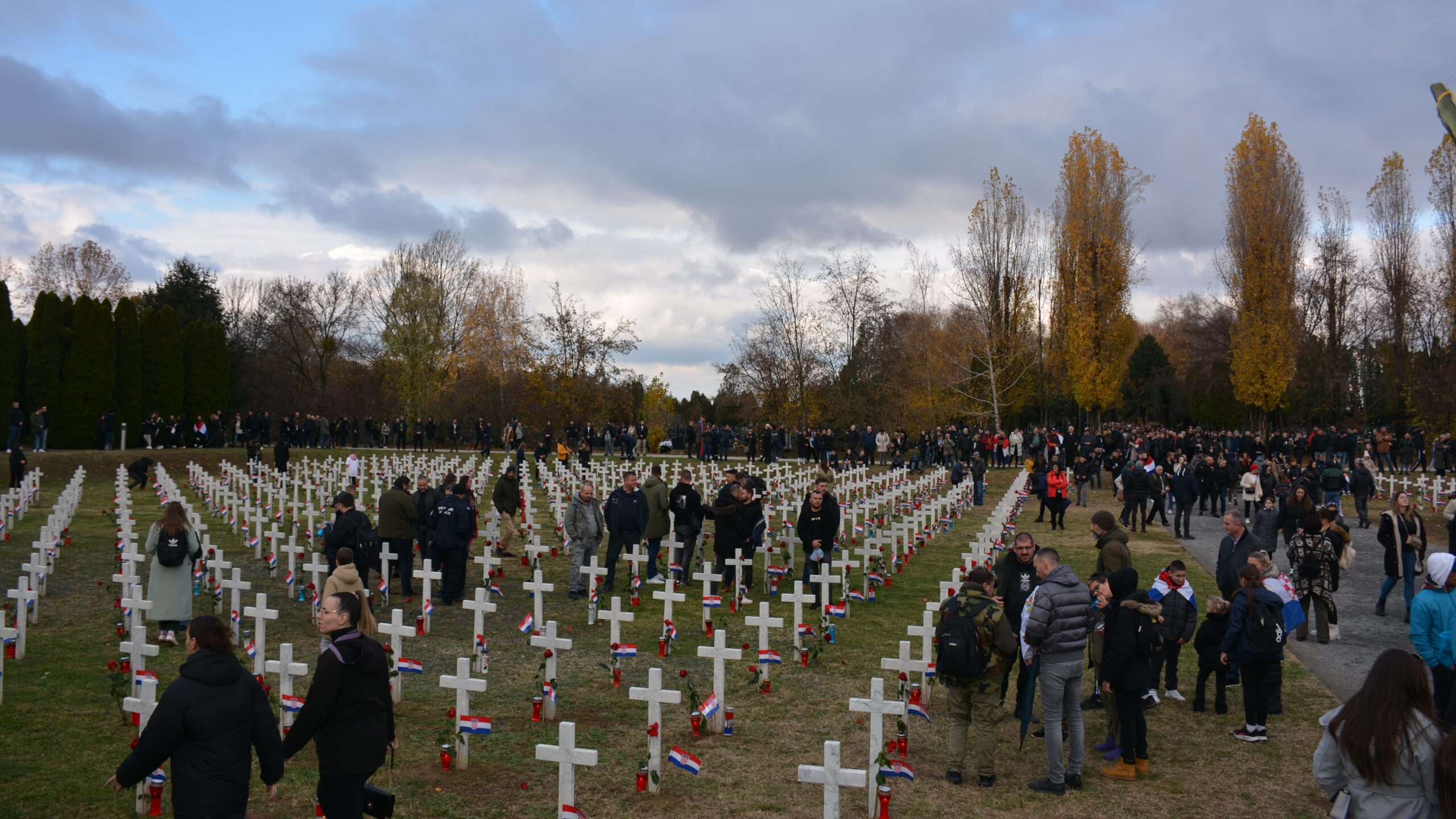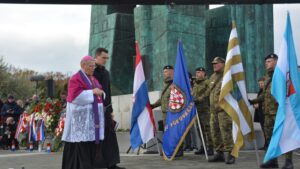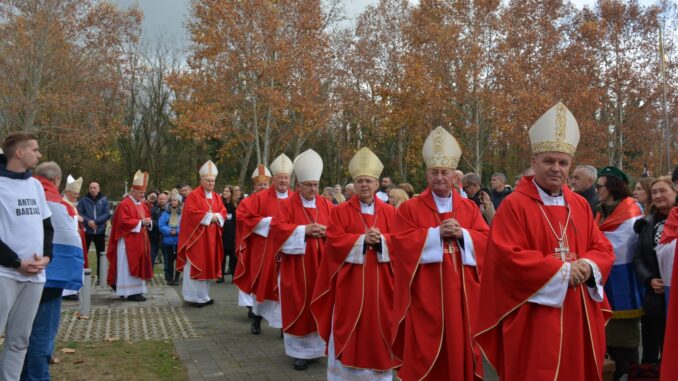 VUKOVAR (TU) – Mons. Tomislav Rogić, šibenski biskup predvodio je misno slavlje na Memorijalnom groblju u Vukovaru 18. studenoga 2025. na nadbiskupijskom spomen-hodočašću o 34. obljetnici stradanja Vukovara. Uz đakovačko-osječkog nadbiskupa Đuru Hranića koncelebrirala su još 18 nad/biskupa, nekoliko provincijala i više od 50 svećenika. Posluživali su đakovački bogoslovi i đakoni Gutenberg Sourou Hounye i Hermann Zinsou Kodjo .