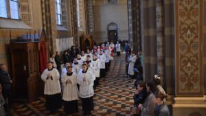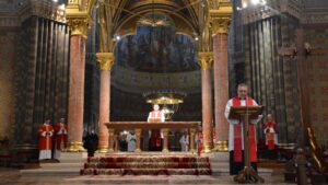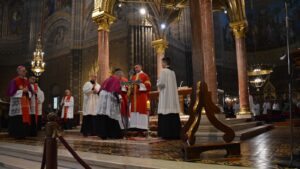 Euharistijskom službom i podjelom pričesti završeni su obredi Velikoga petka. Presveti Oltarski Sakrament je sa oltara u procesiji kroz katedralu prenesen do Isusova groba gdje su vjernici mogli moliti i klanjati se u tišini. Tiskovni ured