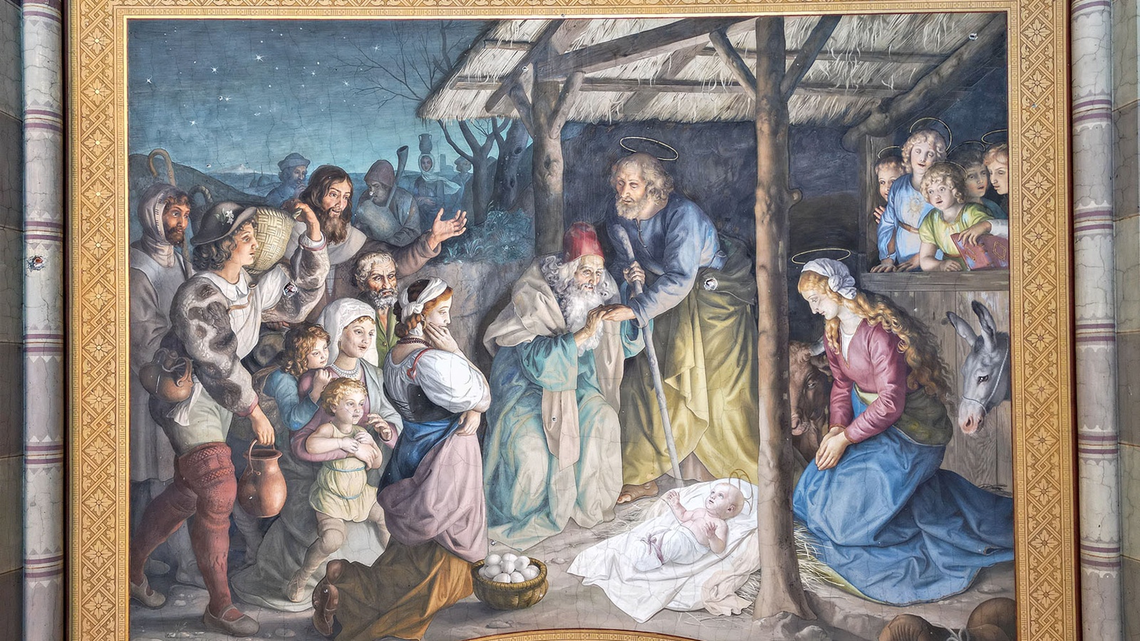 Iz te suradnje nastala je jedna od najvažnijih slikarskih cjelina 19. stoljeća u ovom dijelu Europe. Izložba se posebno usredotočuje na dvije božićne freske – Božić i Poklonstvo kraljeva. Freska Božić prikazuje prizor Kristova rođenja u noćnom ozračju, obasjanom blagim svjetlom koje izvire iz samog Djeteta, dok su Marija, Josip i pastiri prikazani skromno i sabrano, u duhu poniznosti i blizine običnom čovjeku.