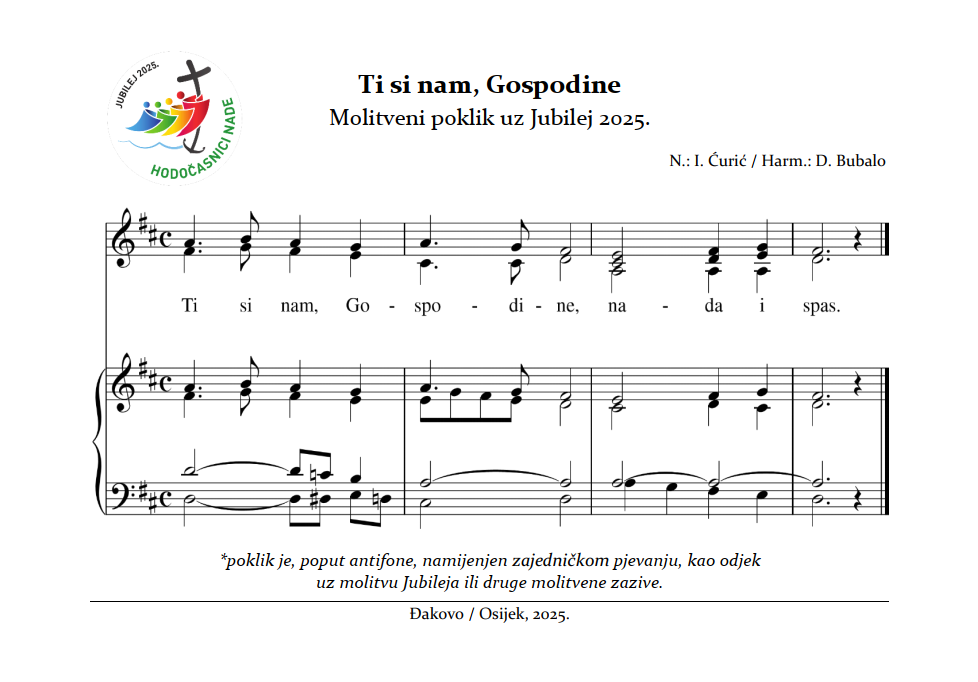 ĐAKOVO (TU) – U godini Jubileja nade 2025. i u prigodi velikoga hrvatskoga nacionalnog hodočašća u Rim od 5. do 11. listopada 2025. u Đakovačko-osječkoj nadbiskupiji priređen je mali pjevani poklik „Ti si nam, Gospodine, nada i spas!“