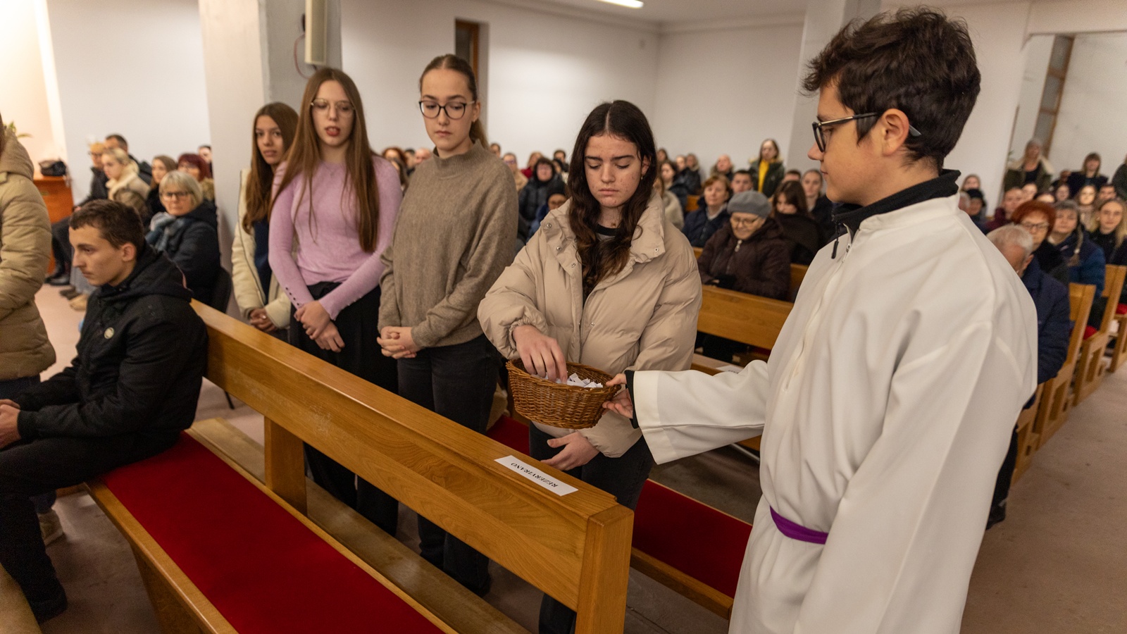 Uslijedilo je prozivanje krizmanika. Na pročitano ime svaki je krizmanik odgovorio: „Evo me!“ te se uputio prema oltaru. Vjeroučitelj Petar Kopunović Legetin zapalio je za svakog lučicu na plamenu betlehemskog svjetla te ju predao krizmaniku. Župni zbor je zapjevao pjesmu „I na tvojim rukama“, koja započinje riječima „Evo me…“. Nakon blagoslovne molitve, krizmanici su odložili lučice pred oltar i vratili se na svoja mjesta.