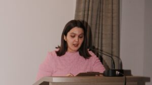Uslijedila je uskrsna čestitka predsjednice Studentskog zbora Jelene Živković, koja je u svom govoru istaknula središnje otajstvo kršćanske vjere – muku, smrt i uskrsnuće Isusa Krista. Naglasila je veličinu Božje ljubavi koja se očituje u Kristovoj žrtvi, ali i u svakodnevnim patnjama i izazovima suvremenog čovjeka. Posebno je istaknula kako križ nije znak kraja, nego nade i novoga početka, podsjećajući da se upravo u patnji očituje snaga uskrsnuća. Govor je bio prožet porukama ohrabrenja, pozivom na vjeru, nadu i djelatnu ljubav prema bližnjima. Zaključno je svima uputila želju za blagoslovljenim Uskrsom, potičući prisutne da u svojim životima prepoznaju i žive radost uskrsnuća.