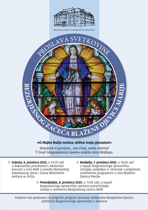 U ponedjeljak, 8. prosinca u 11 sati u kapeli Bogoslovnoga sjemeništa: svečano euharistijsko slavlje o svetkovini Bezgrješnog začeća Blažene Djevice Marije predvodi đakovačko-osječki nadbiskup metropolit Đuro Hranić.