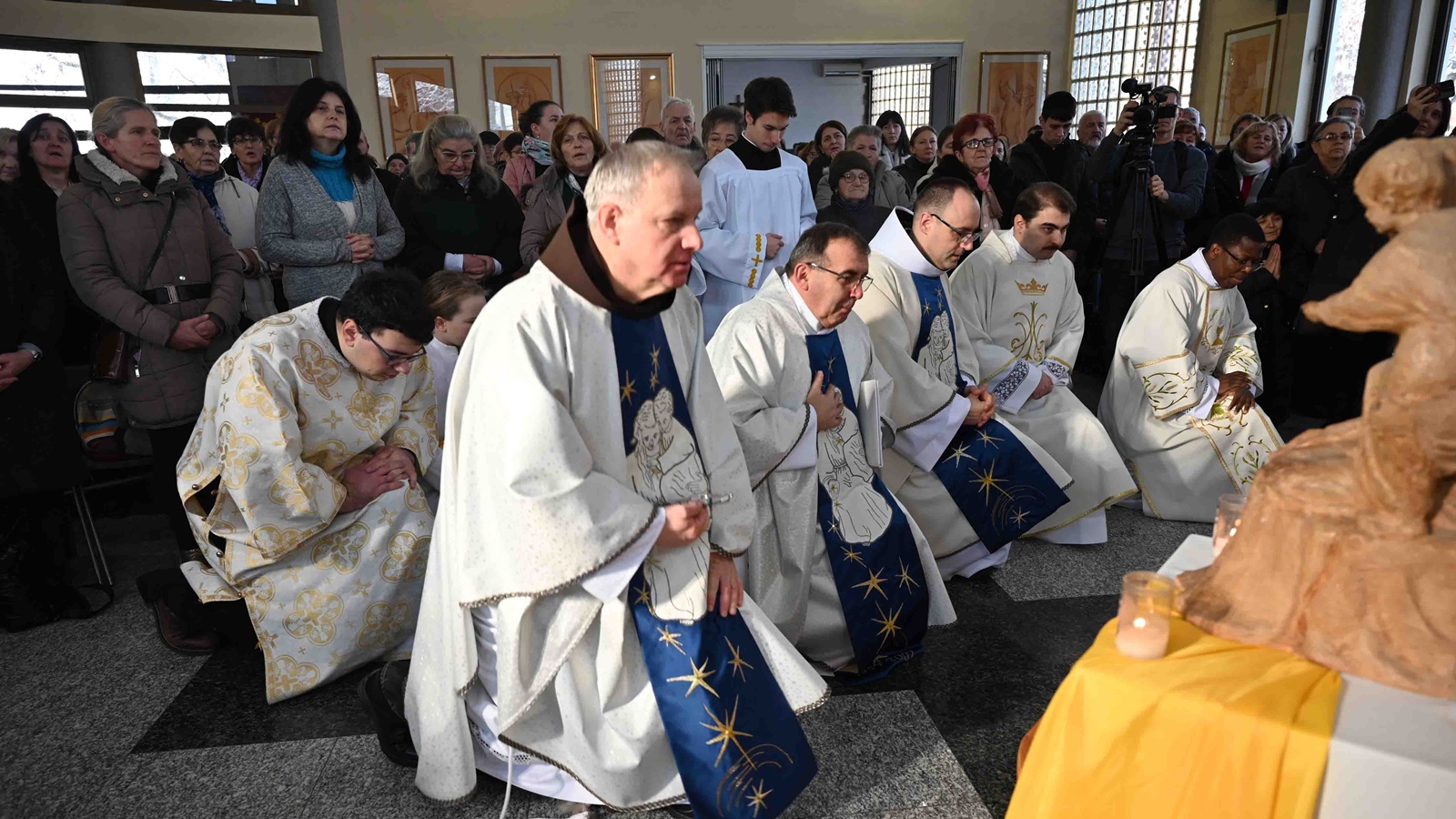 SLAVONSKI BROD (TU) – Svetkovina Gospe Brze Pomoći, nebeska zaštitnica istoimenog Gospina svetišta i župe u Slavonskom Brodu svečano je proslavljena u četvrtak, 8. siječnja 2026. Unatoč niskim temperaturama brojni su hodočasnici već od jutarnjih sati pristizali u svetište kako bi molili i zahvalili dragoj Gospi za tolike milosti. U nemogućnosti dolaska đakovačko-osječkog nadbiskupa Đure Hranića središnje blagdansko slavlje u Pastoralnom centru župe predvodio je župnik Anđelko Cindori u zajedništvu s gvardijanom fra Slavkom Milićem, ravnateljem klasične gimnazije Fra Marijana Lanosovića fra Ivanom Crnkovićem i župnim vikarom Josipom Vuksanovićem.