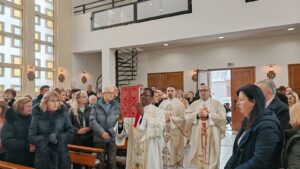 Kod oltara je posluživao đakon, vlč. Gutenberg Sourou Hounye, koji odnedavno obavlja đakonsku službu u slavonskobrodskom svetištu Gospe Brze Pomoći