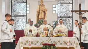 BRODSKI VAROŠ (TU) – Svetkovinu Isusa Krista – Kralja svega stvorenja, ujedno i svoj župni god, 23. studenoga 2025. g. svečano su proslavili župljani Župe u Brodskom Varošu sudjelovanjem na euharistijskom slavlju koje je u župnoj crkvi, jedinoj u Đakovačko-osječkoj nadbiskupiji posvećenoj Kristu Kralju predslavio vlč. dr. Davor Vuković, profesor na KBF-u u Đakovu, predstojnik instituta za novu evangelizaciju „ Sveti Ivan Pavao II., papa te sveučilišni kapelan Sveučilišta J. J. Strossmayera u Osijeku. Koncelebrirao je domaći župnik Božidar Nađ koji je predslavio jutarnje blagdansko bogoslužje.