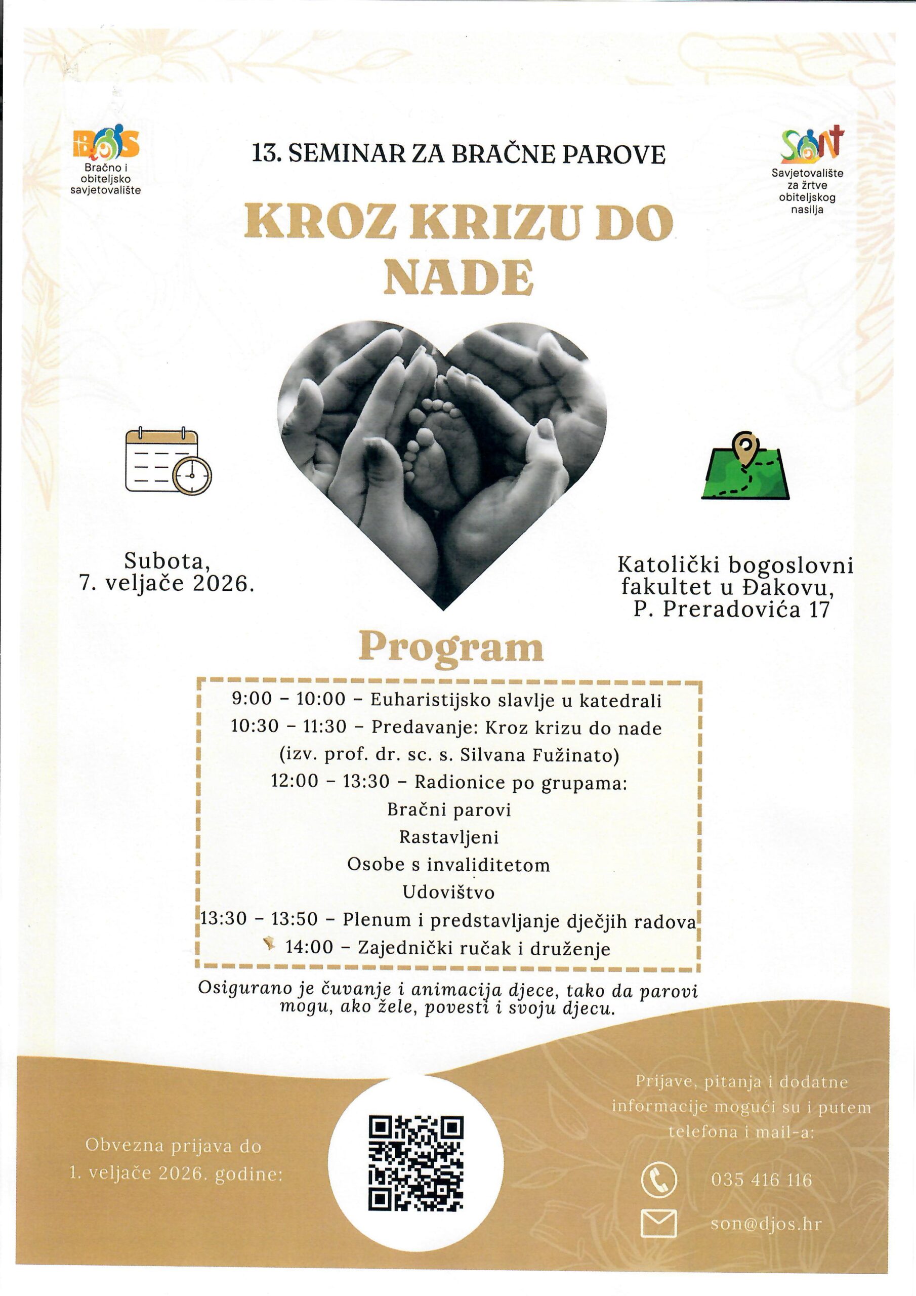 ĐAKOVO (TU) – Bračna i obiteljska savjetovališta Đakovačko-osječke nadbiskupije, uz podršku Pastoralnog centra Đakovačko-osječke nadbiskupije, organiziraju 13. seminar za bračne parove pod nazivom „Kroz krizu do nade“ koji će se održati u subotu, 7. veljače 2026. godine, s početkom u 9 sati, u prostorima Katoličkog bogoslovnog fakulteta u Đakovu te u katedrali sv. Petra. Seminar se održava u ozračju Svjetskog dana braka, a ujedno je dio pripremnih aktivnosti za Nacionalni dan obitelji osoba s invaliditetom 2026. u Aljmašu i Osijeku.
