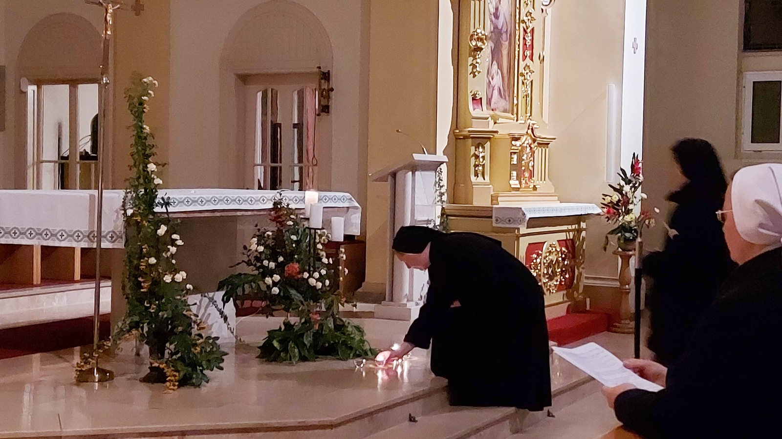 Pred kraj molitvenog susreta, predstavnica svake zajednice u Đakovu, zapalila je svjećicu pred oltarom kao znak Nade. Taj plamen svijeće predstavlja zajedničku Nadu – svjetlo koje nikakva tama ne može nadvladati. Sestre, nositeljice nade, i dalje žele nositi to svjetlo kao izraz suosjećanja i solidarnosti za sve zarobljene, ponižavane i iskorištavane.