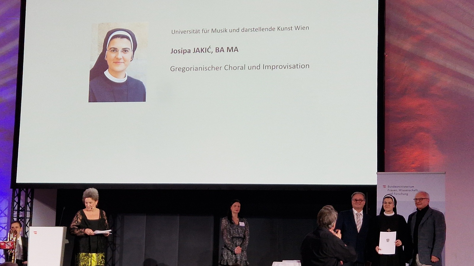 Na temelju izvanrednih akademskih postignuća, izvrsne izvedbe svih koncerata i stručnog, originalnog diplomskog rada, sestri Josipi Pavli Jakić dodijeljena je ova državna nagrada uz novčani iznos od 3.000 eura, i to na prijedlog Sveučilišta za glazbu i primijenjenu umjetnost u Beču.