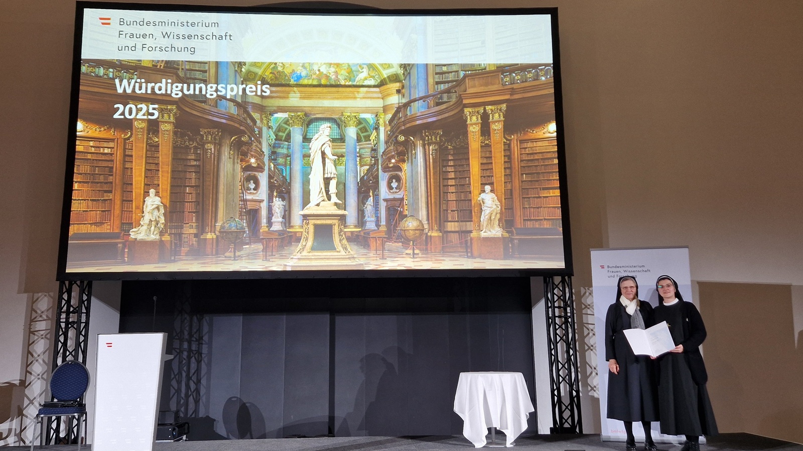 U ime ministrice Eve-Marie Holzleitner, nagrade je uručio Mag. Heribert Wulz, koji je dobitnicima uputio dojmljive riječi zahvalnosti i priznanja: „Današnji laureati uspjeli su s velikim zanosom, unutarnjom predanošću i ustrajnošću ispuniti visoke zahtjeve ove nagrade: svi završni ispiti na preddiplomskom i diplomskom studiju položeni su s najvišim uspjehom; kvaliteta i originalnost diplomskog rada u potpunosti su dostojne ovoga priznanja, a studij je završen u redovitom roku. Ova počasna nagrada više je od priznanja – ona je izraz zahvalnosti i dubokog poštovanja. Trebaju nam ljudi koji preuzimaju odgovornost, koji hrabro koračaju naprijed širokog pogleda, ne gubeći iz vida vrijednost zajedništva. Upravo za to se zalažu ovogodišnji dobitnici. Ovakvi uspjesi nisu sami po sebi razumljivi – za njih su potrebni motivacija, ustrajnost i čvrsto unutarnje uvjerenje da se nešto može postići. Ova nagrada donosi i nadu da ovi uspjesi nisu završetak, nego početak novih umjetničkih i znanstvenih putova. Neka vas ohrabri na vašem daljnjem putu i neka bude znak za naše društvo i zajednicu.“