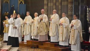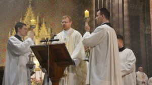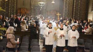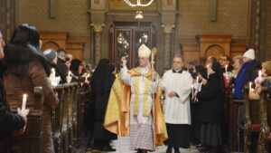 ĐAKOVO (TU) – Svečanom procesijom u đakovačkoj katedrali u kojoj su uz bogoslove i svećenike te đakovačko-osječkog pomoćnog biskupa Ivana Ćurića sudjelovale i Milosrdne sestre sv. Križa u ponedjeljak, 2. veljače 2026. započelo je večernje slavlje Svijećnice i Dana posvećenog života. U podnožju katedrale biskup Ivan je predvodio obred blagoslova svijeća, a nakon što je svjetlo svijeća ovladalo katedralom on je prošao između naroda i sve poškropio blagoslovljenom vodom.