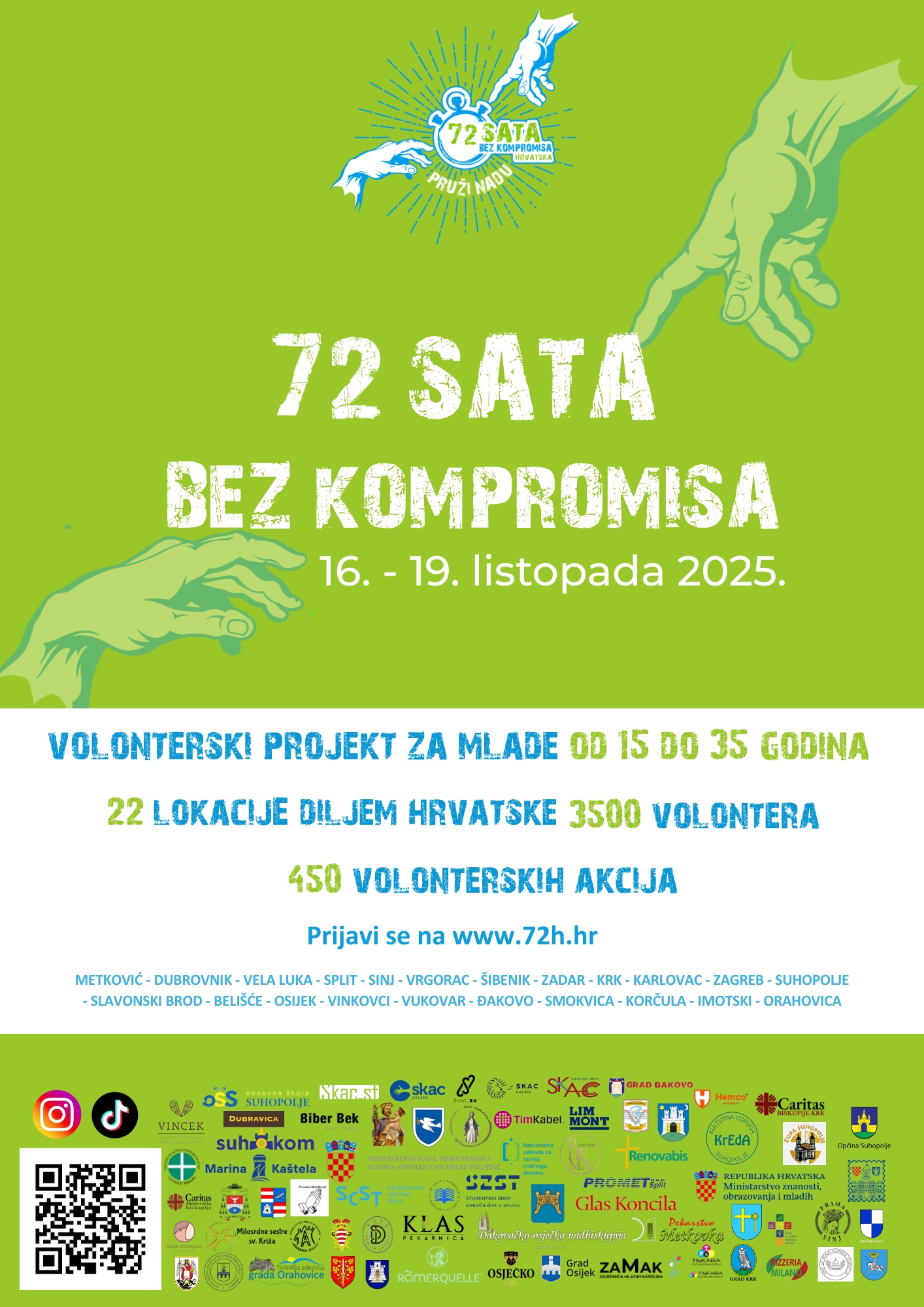 ĐAKOVO (TU) – Večernjim misnim slavljem u đakovačkoj katedrali, u četvrtak, 16. listopada 2025. koje je predvodio dr. Stjepan Radić, rektor Bogoslovnog sjemeništa započeo je volonterski projekt 72 sata bez kompromisa, koji se u Đakovu provodi drugu godinu. Koncelebrirali su: Alojz Kovaček, katedralni župnik; mr. Stjepan Matezović, duhovnik u Bogoslovnom sjemeništu i mons. Luka Marijanović, kanonik, a posluživali đakovački bogoslovi.