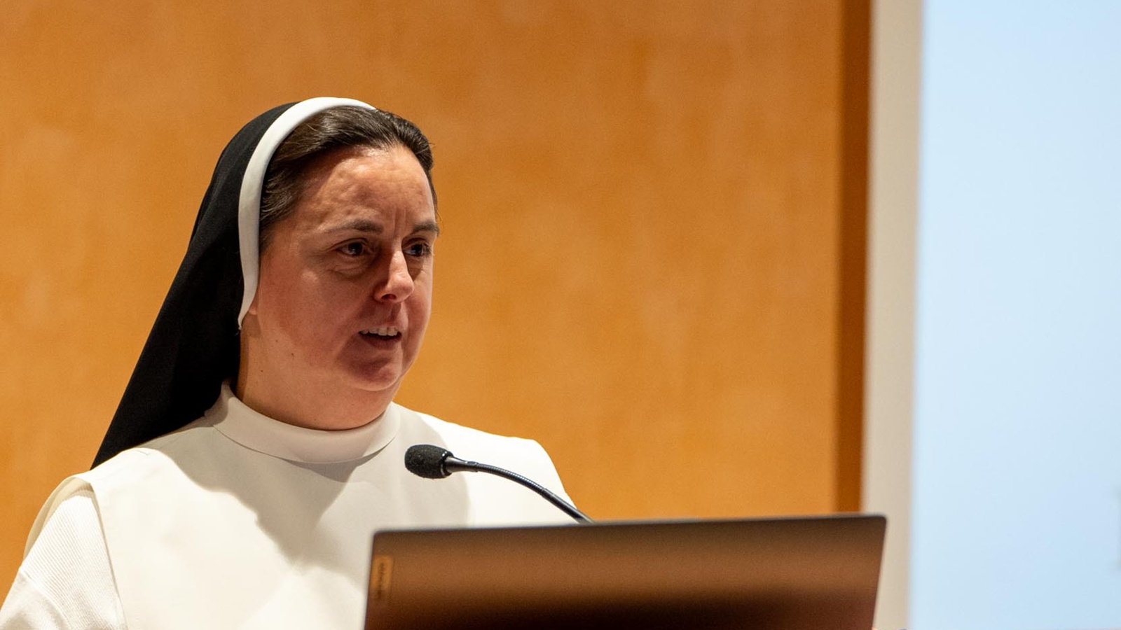 „Naša tijela, kaže predavačica, evoluirala su u zajedništvu, usmjereni smo na drugoga. Slični smo Bogu u činu zajedništva. Danas se pak tijelo omalovažava, od njega se čini instrument, no naše tijelo je sposobno učiniti vidljivim ono što je nevidljivo.“