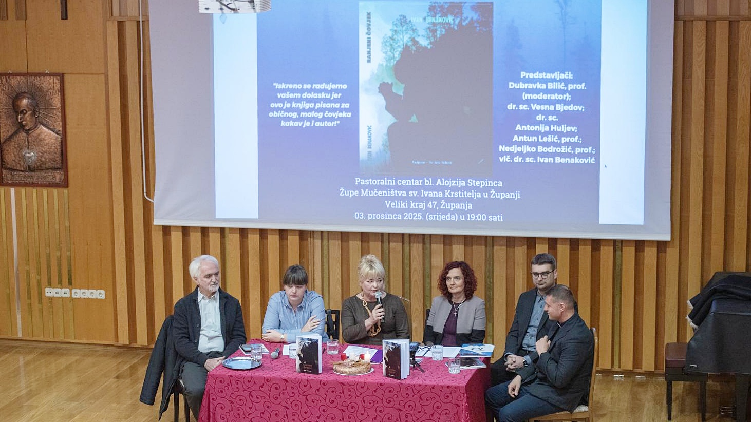 ŽUPANJA (TU) – U ispunjenoj dvorani Pastoralnog centra bl. Alojzija Stepinca u Županji, Župe Mučeništva sv. Ivana Krstitelja, u srijedu, 3.prosinca 2025. godine održano je svečano predstavljanje knjige vlč. dr. sc. Ivana Benakovića „Ranjeni čovjek“, inače rodom Županjca. Predstavljački tim pod moderiranjem prof. Dubravke Bilić (Gimnazija Županja) bili su: prof. dr.sc. Vesna Bjedov (FFOS), doc. dr. sc. Antonija Huljev (FOOZOS), Antun Lešić, prof. (Gimnazija Županja) i Nedjeljko Bodrožić, prof. (Admiral Tisak).