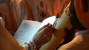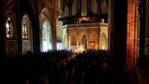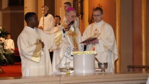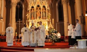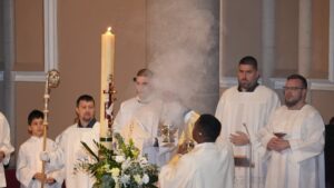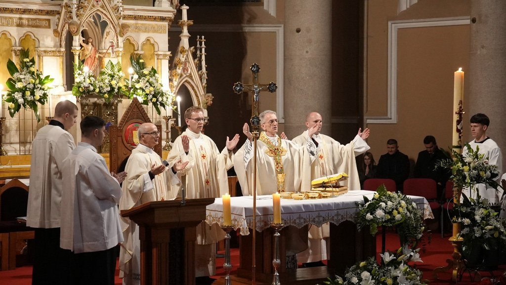 svijeće u mrakom zavijenu konkatedralu, uz poklik “Svjetlo Kristovo” i rasvjetljavanje konkatedralne lađe, đakon Hermann Zinsou Kodjo ispjevao je Exultet – hvalospjev uskrsnoj svijeći. Uslijedila je Služba riječi tijekom koje su ponovno zazvonila sva zvona, a Mješoviti konkatedralni zbor pod vodstvom s. Branke Čutura, uz orguljsku pratnju Dalibora Ratića, zapjevao je pjesmu Slave. U koncelebraciji je bio prof. dr.