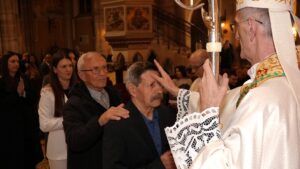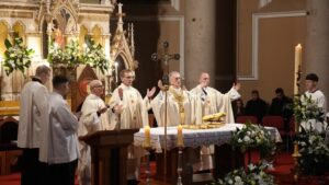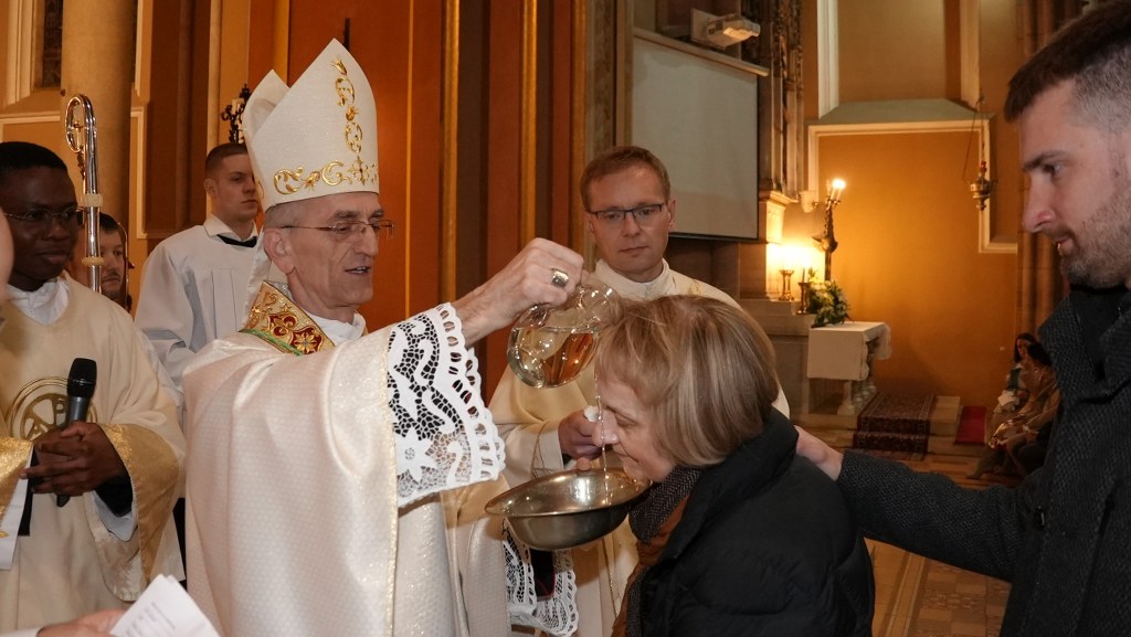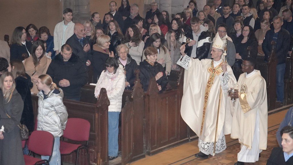 blagoslovljenom vodom i euharistijska služba. Konkatedralni župink zatim je nadbiskupu Ivanu i svim prisutnim vjernicima, napose župnim suradnicima, čestitao je Uskrs, a biskup Ivan je zahvalio i uzvratio čestitkom te katekumene, ali i sve vjernike, potaknuo na neizostavno sudjelovanje na misnim slavljima nedjeljom, osobnu molitvu, poniranje u nutrinu te uključenje u život svoje župne zajednice – kako bi nastavili hod u vjeri koji su sada započeli.