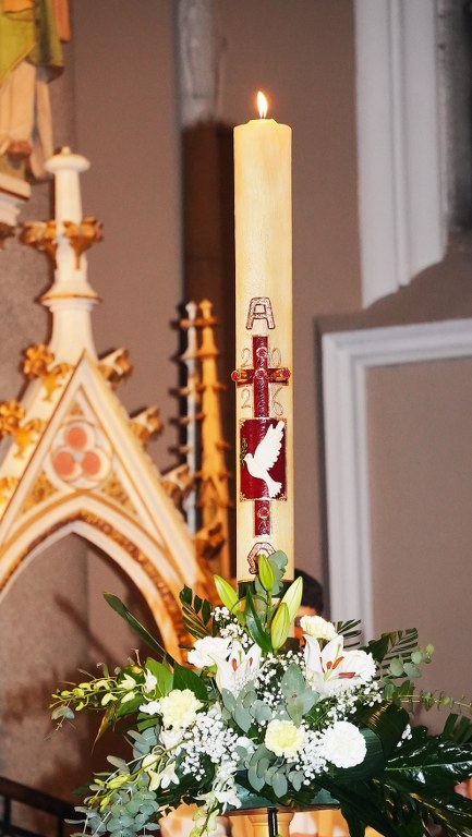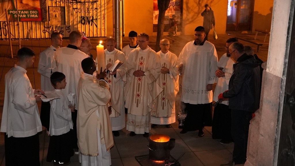 Obredi Vazmenoga bdjenja započeli su blagoslovom ognja ispred osječke konkatedrale te ukrašavanjem i paljenjem uskrsne svijeće. Nakon svečanog unošenja uskrsne