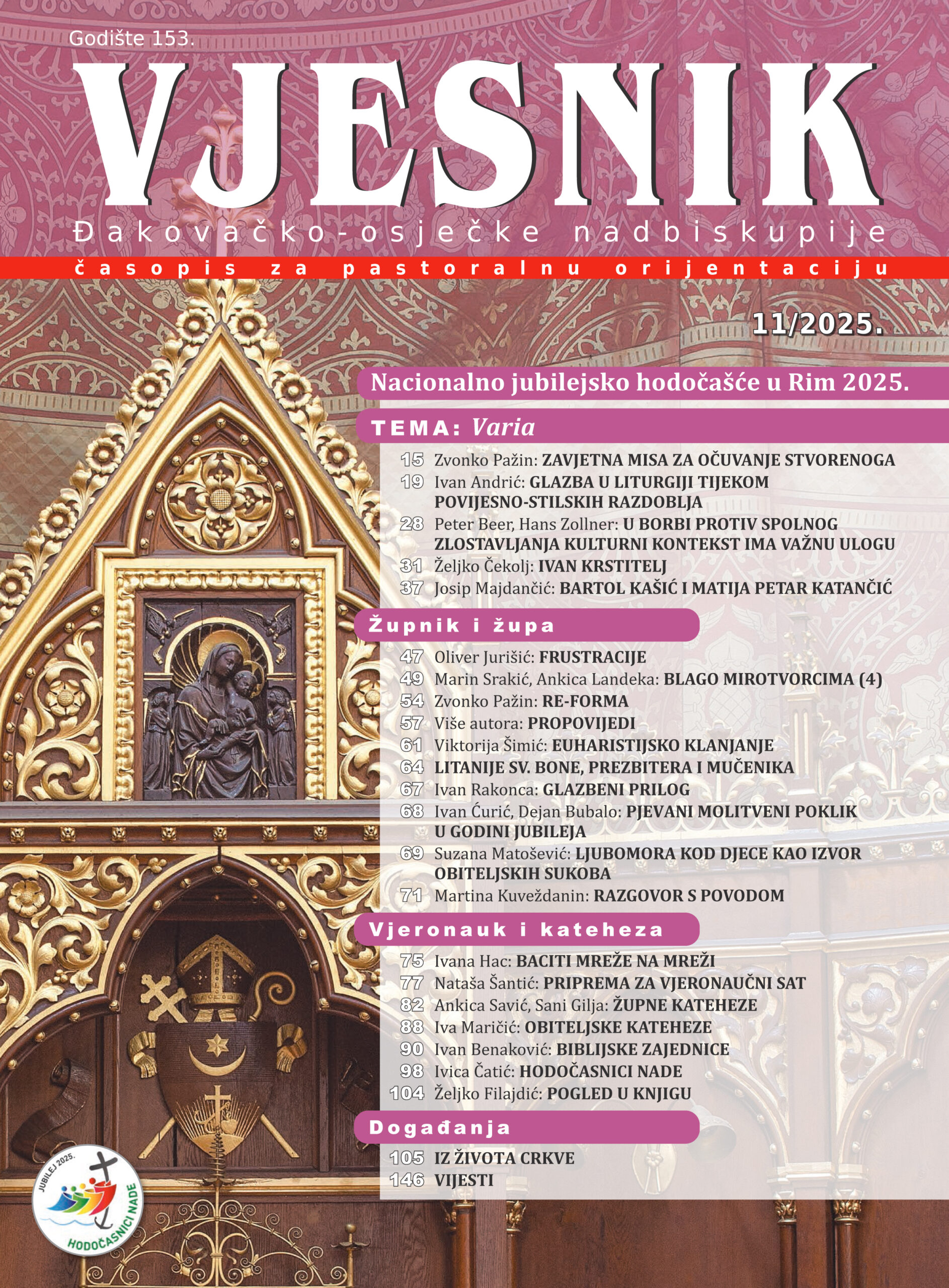 ĐAKOVO (TU) – Vjesnik Đakovačko-osječke nadbiskupije za studeni 2025. započinje izvješćem o Nacionalnom jubilejskom hodočašću u Rim, a izvješće prati i fotogalerija na omotu broja. U nastavku se nalaze različiti tematski članci: Zvonko Pažin („Zavjetna misa za očuvanje svega stvorenoga“); Ivan Andrić („Glazba u liturgiji tijekom povijestno-stilskih razdoblja); Peter Beer – Hans Zollner / Josip Bošnjaković – Damjan Kovač (pr.) – („U borbi protiv spolnog zlostavljanja u Katoličkoj Crkvi kulturni kontekst ima važnu ulogu“); Željko Čekolj („Ivan Krstitelj“); Josip Majdandžić („Bartol Kašić“; „Matija Petar Katančić“).