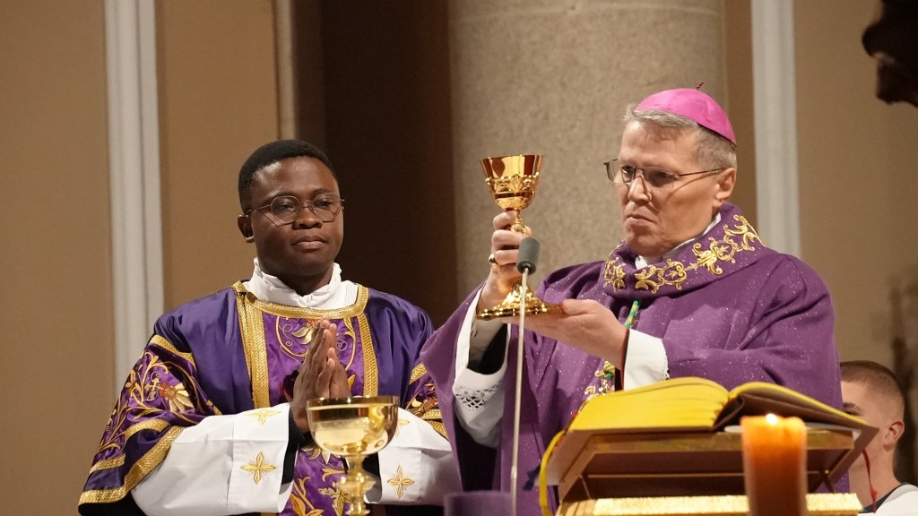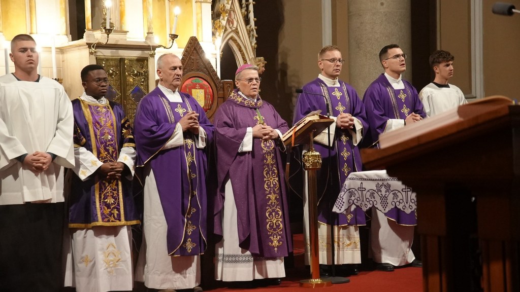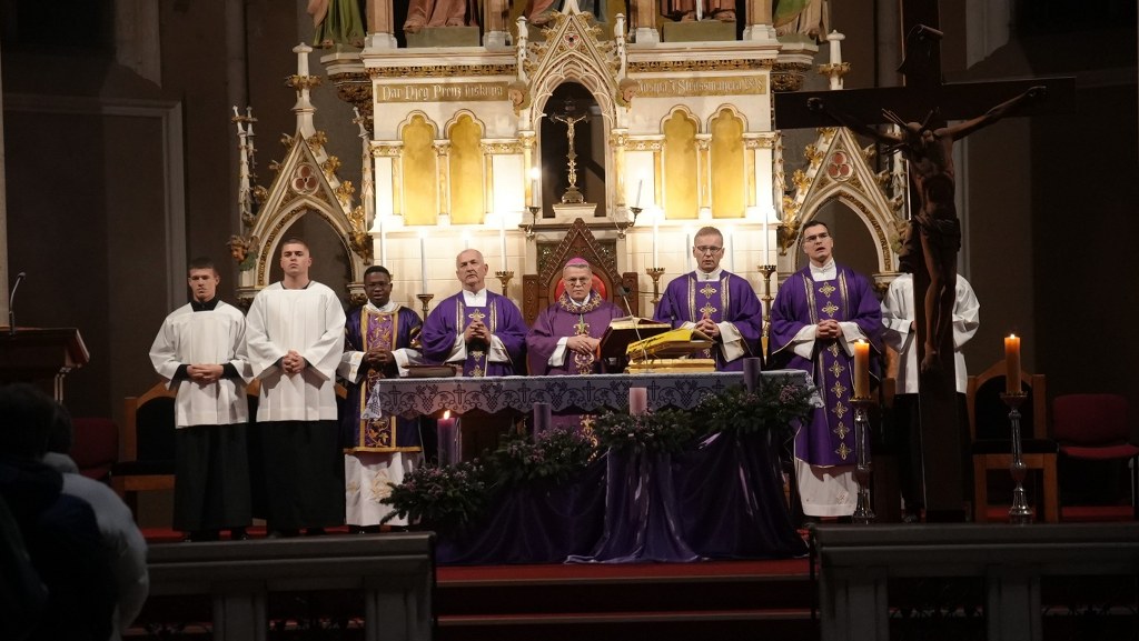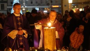 OSIJEK (TU) – U osječkoj konkatedrali sv. Petra i Pavla na Prvu nedjelju došašća, 30. studenoga 2025., đakovačko-osječki nadbiskup metropolit Đuro Hranić predvodio je svečano misno slavlje uoči proslave Dana grada Osijeka te je upalio prvu svijeću na adventskom vijencu ispred konkatedrale. U koncelebraciji je bio ravnatelj Nadbiskupskog vikarijata i Caritasa Đakovačko-osječke nadbiskupije, preč. dr. Drago Tukara, domaći župnik Matej Glavica, tajnik Nadbiskupskog ordinarijata – vlč. Nikola Klemen, a posluživao je đakon Hermann Zinsou Kodjo. Liturgijsko pjevanje, kao i ono pri paljenju prve adventske svijeće, animirao je Konkatedralni zbor mladih pod vodstvom Domagoja Vukadina.