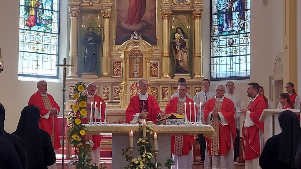 Mons. Ćurić u homiliji je pozvao sestre da svoje misli usmjere prema evanđelju i podsjetio kako se Evanđelje po Marku smatra najstarijim. Krenuvši od značenja poziva apostola, posebno na temelju aktualnoga evanđeoskog teksta (Mk 16, 15-20) rekao je: „Kad prebiremo po povijesti Crkve, jasno uviđamo da ju uvijek iznova, i to najplodonosnije, obnavlja samo evanđeoski duh. U godini smo jubilejskoga spomena 800. obljetnice preminuća sv. Franje. U danima pred svoj odlazak, pripravljajući se na susret sa ‘sestricom smrću’, kažu nam svjedočanstva, svoju je braću upućivao da nijedno pravilo života ne pretpostave Evanđelju. Kako se i Franjin put rascvjetao ‘po svem svijetu’. Zato i u naše suvremeno doba blagopokojni papa Franjo u enciklici ‘Fratelli tutti’ 2020. godine svima, zapravo cijelom svijetu, svim narodima, društvima i kulturama, ponavlja prijedlog sv. Franje Asiškoga da žive ‘oblikom života koji u sebi nosi miomiris evanđelja’. Što od toga dolazi? Reći će papa Franjo: Radost. Jer ‘oni koji prihvate Isusovu ponudu spasenja oslobođeni su od grijeha, žalosti, duhovne praznine i usamljenosti’ (EG 1).“